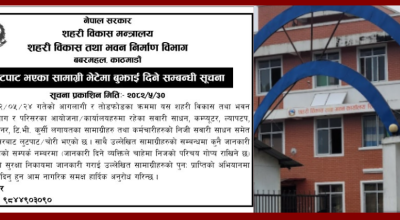 काठमाडौं । शहरी विकास मन्त्रालय अन्तर्गतको भवन निर्माण विभागले जेनजी आन्दोलनका क्रममा लुटपाट भएका सामान फिर्ता गर्न अनुरोध गरेको छ। विभागले सूचना निकाल्दै जेनजी आन्दोलनका क्रममा यही भदौ २४ गते