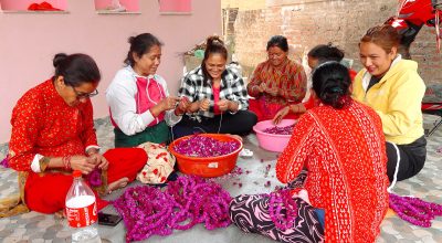 ‘अहिलेको काम भनेको नै बिहान फूल टिप्ने दिनभरी गास्ने नै हो । साउन अन्तिम सातादेखि फुल टिप्न थालेका हौं । फुलबारी र धानबालीसँगै भित्र्याउन समय आयो । तर पहिले ढकमक्क फुलेको फुल टिप्न र माला गास्नमै व्यस्त छौँ । तर विगतको जस्तो फुल उत्पादन नहुँदा माग धान्न गाह्रो छ । फुल कत्ति पनि खेर गएको छैन ।’