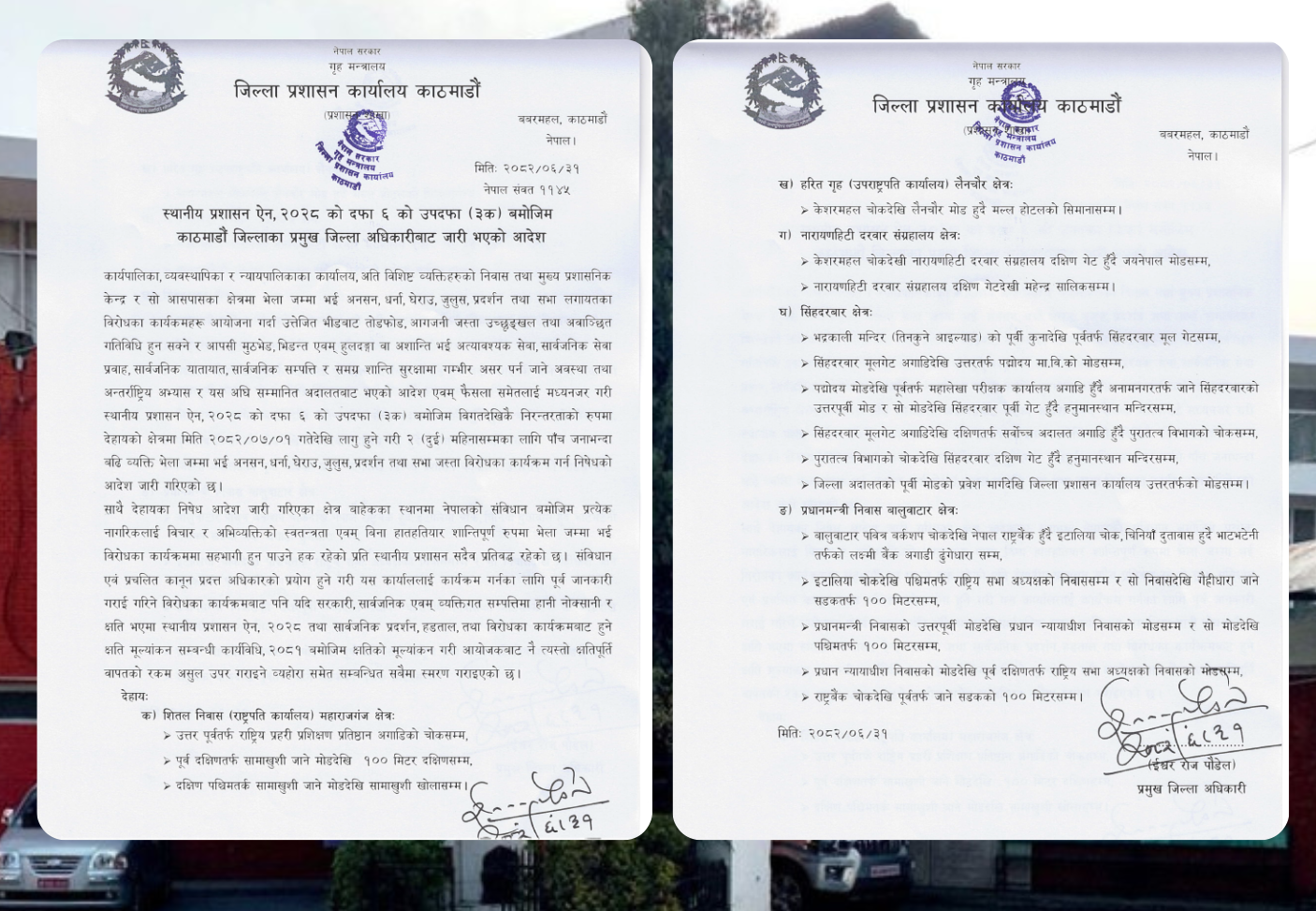 प्रमुख जिल्ला अधिकारी ईश्वरराज पौडेलले शुक्रबार आदेश जारी गर्दै शीतल निवास (राष्ट्रपति कार्यालय) महाराजगन्ज क्षेत्र, हरित गृह (उपराष्ट्रपति कार्यालय) लैनचौर क्षेत्र, नारायणहिटी दरबार संग्रहालय, सिंहदरबार क्षेत्र र प्रधानमन्त्री निवास बालुवाटारलाई निषेधित क्षेत्र उल्लेख गरेको हो ।