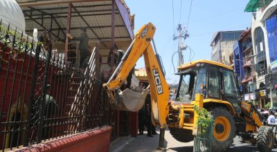 काठमाडाैं महानगरले चलायाे त्रिदेवी मन्दिर ठमेलमा बनेको अनाधिकृत संरचनामा डाेजर (तस्विरहरू)